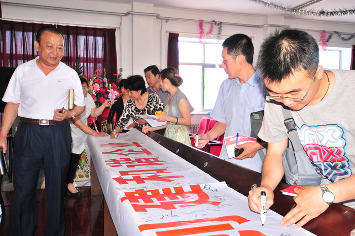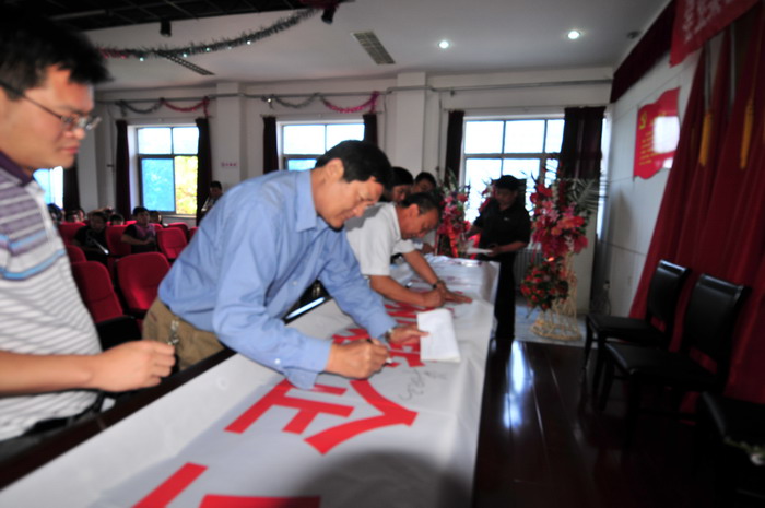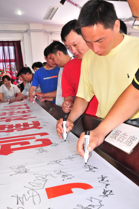 參會人員在“科學(xué)發(fā)展,安全發(fā)展,創(chuàng)建和諧企業(yè),從我做起”條幅上簽字
